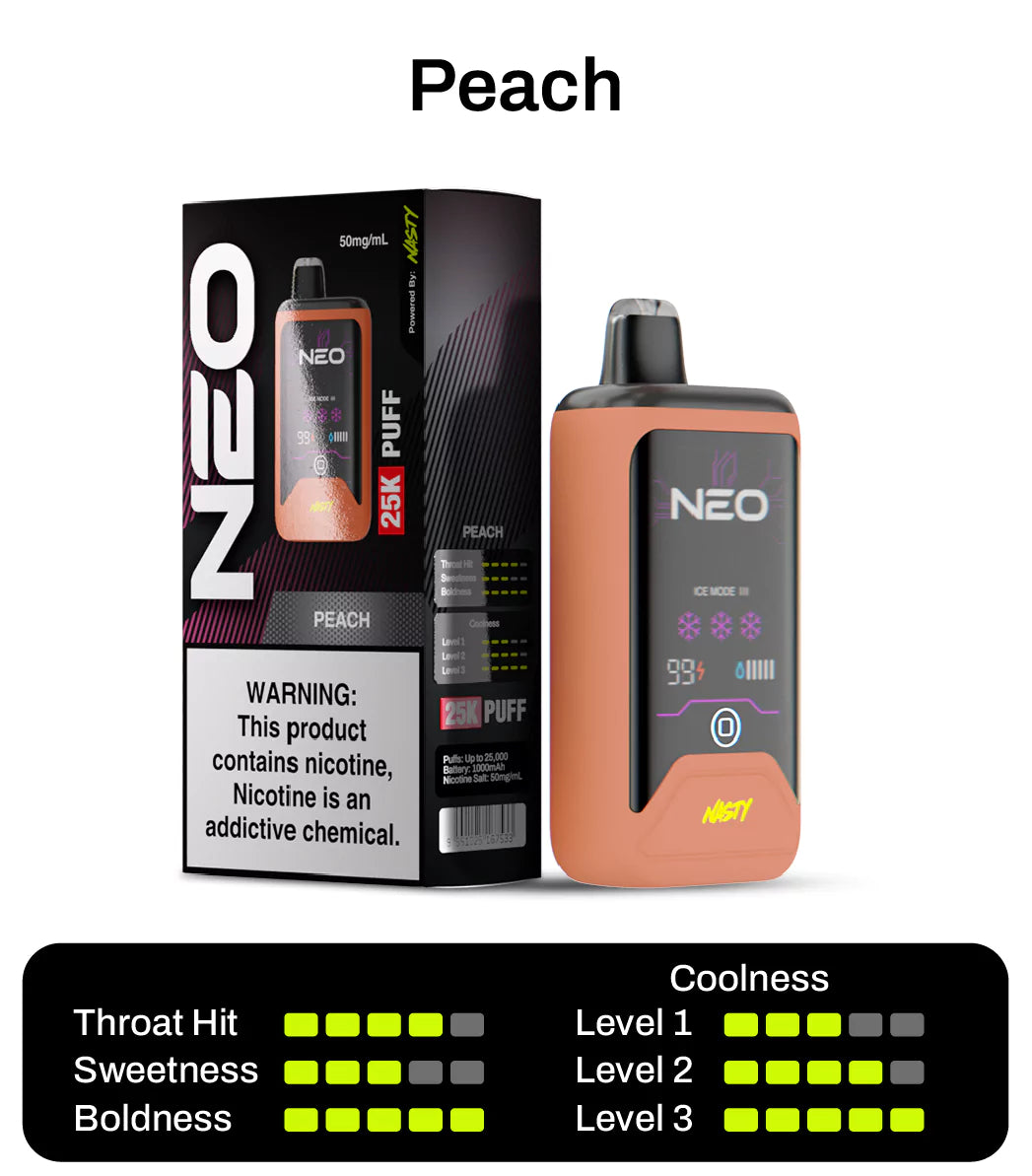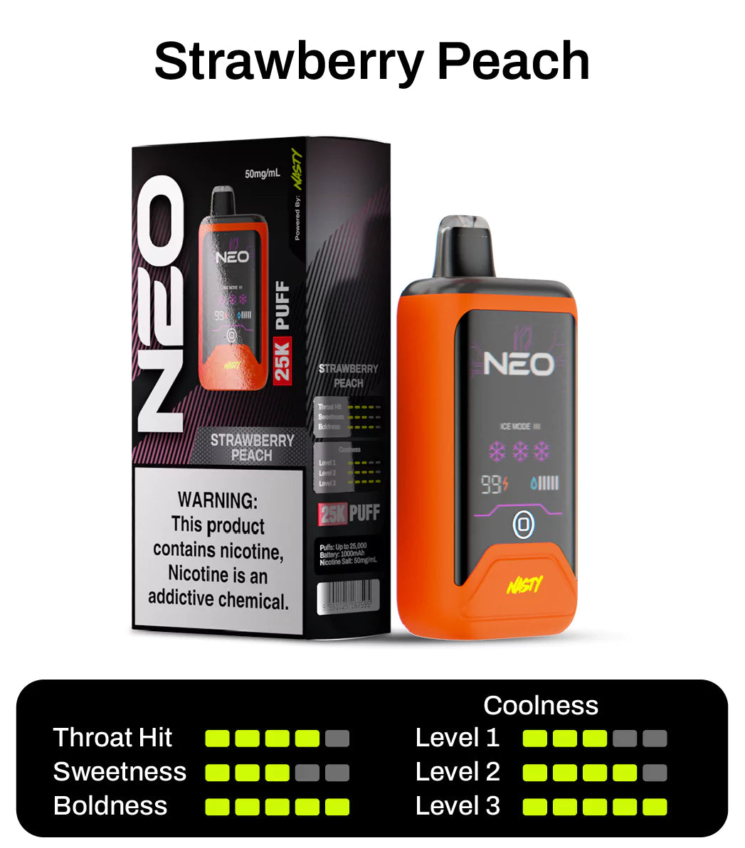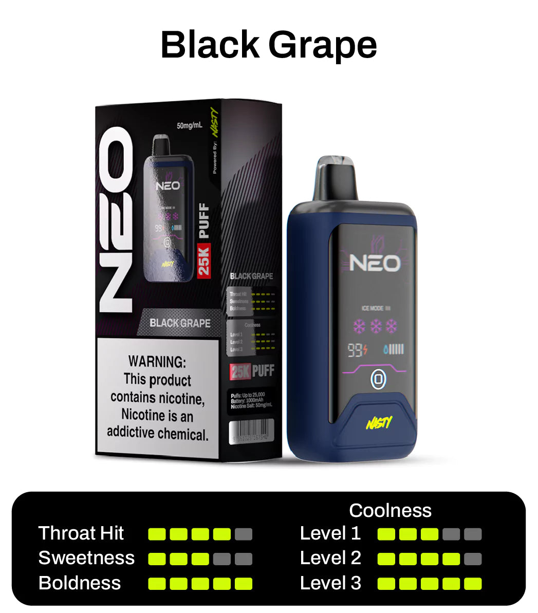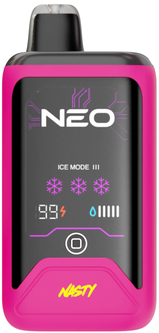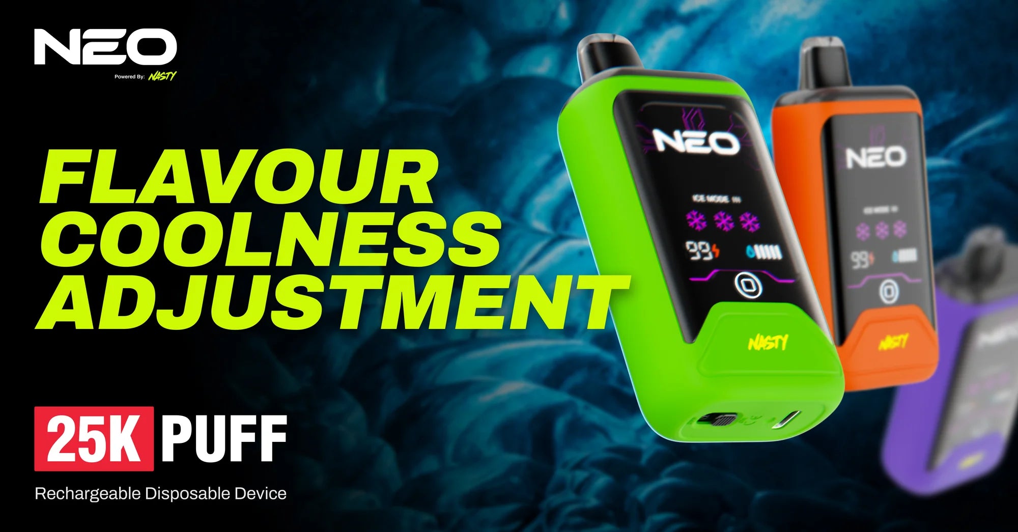 NEO 25K by NASTY is a large capacity rechargeable Nicotine Salt disposable device designed to deliver up to 25,000 puffs of pure flavour satisfaction.