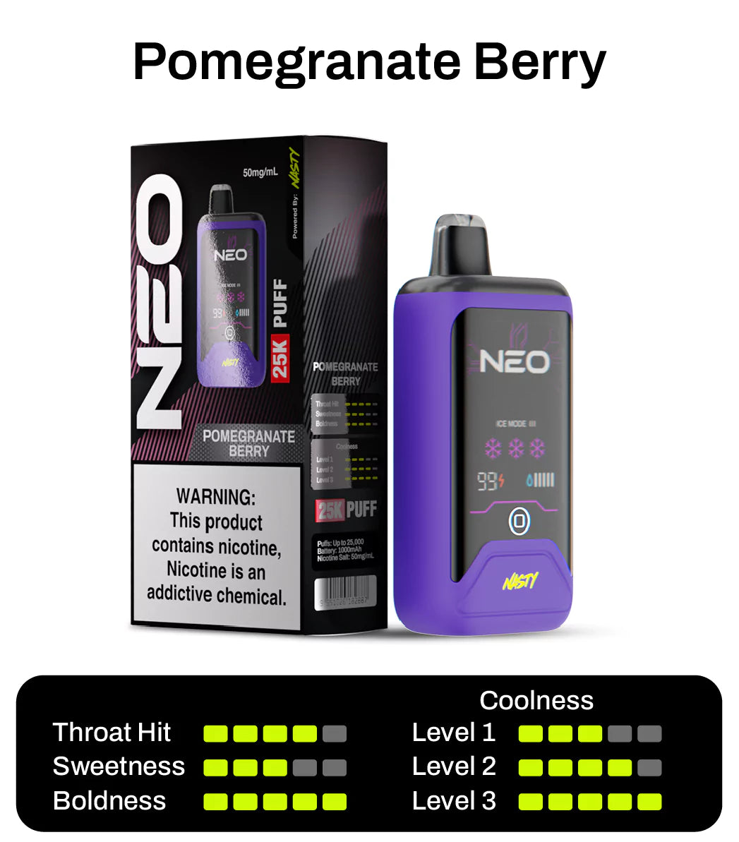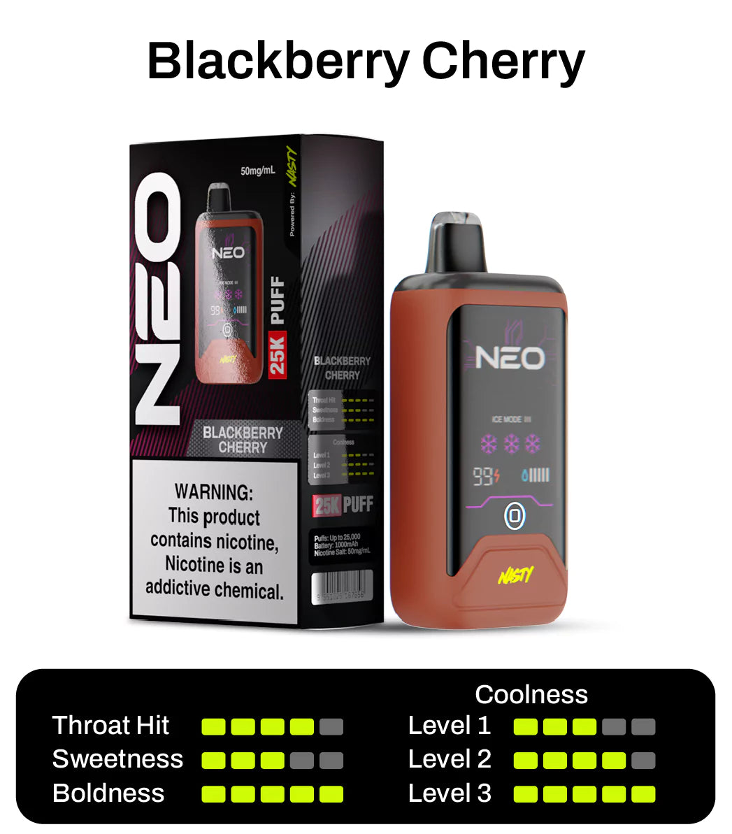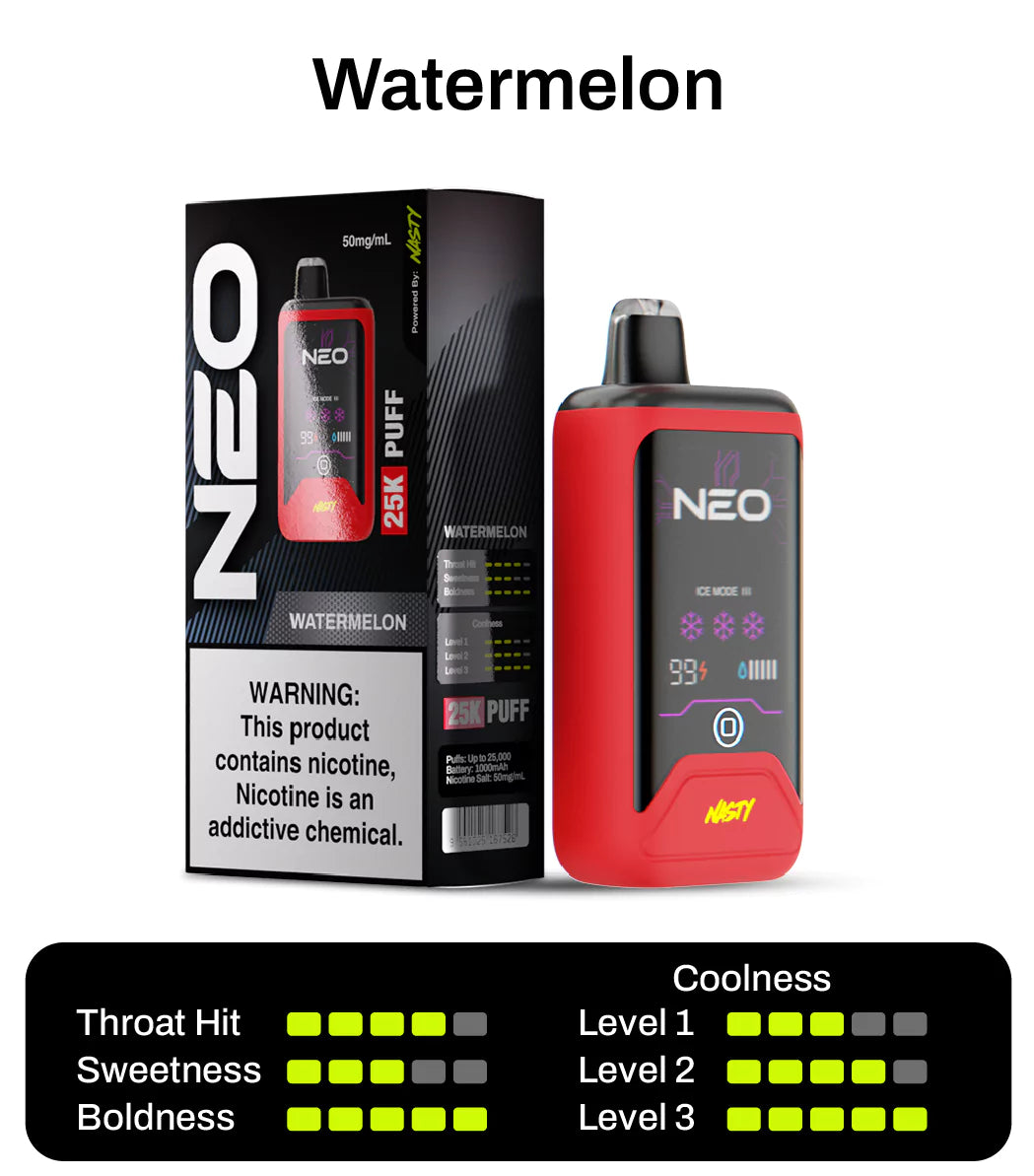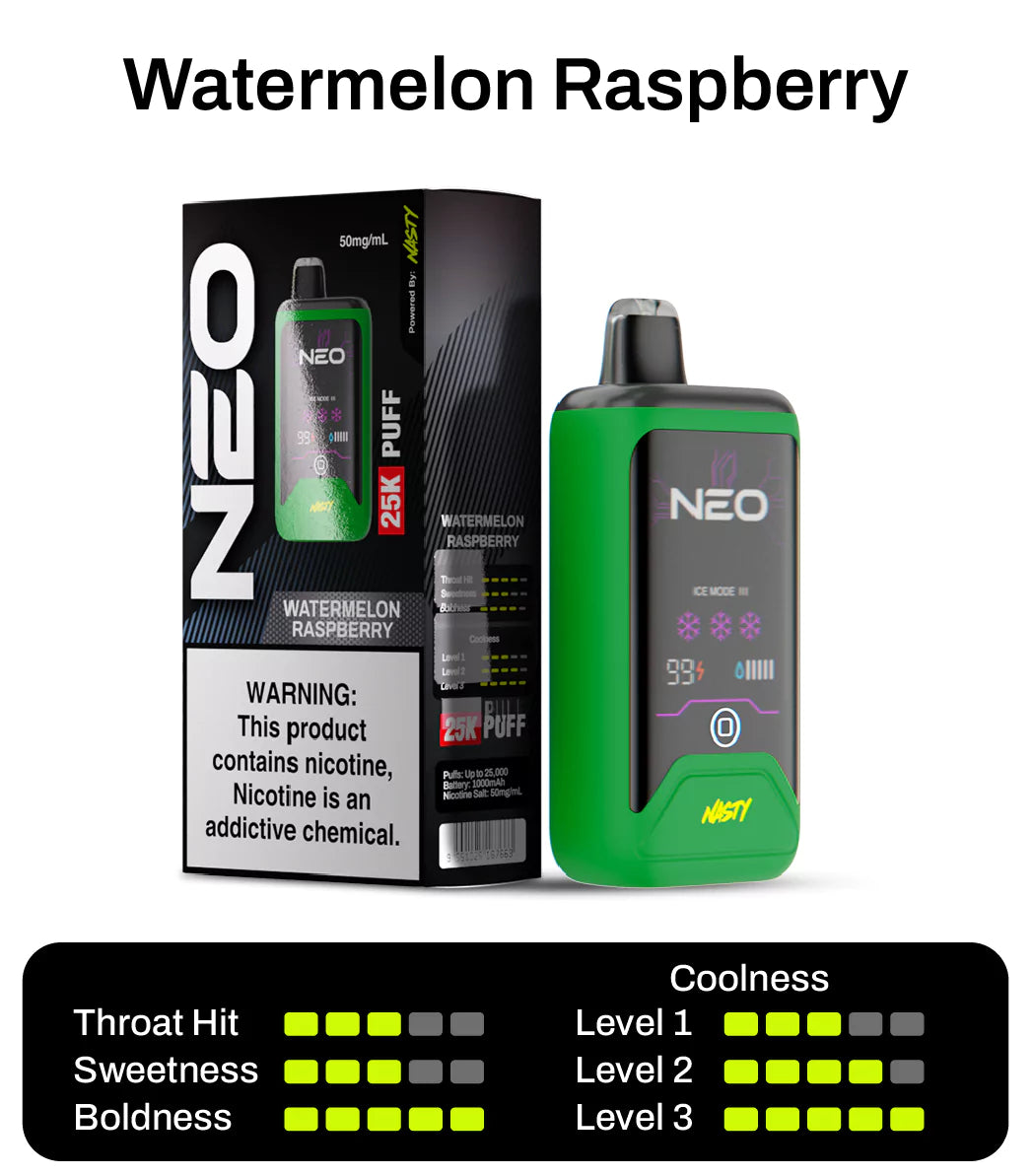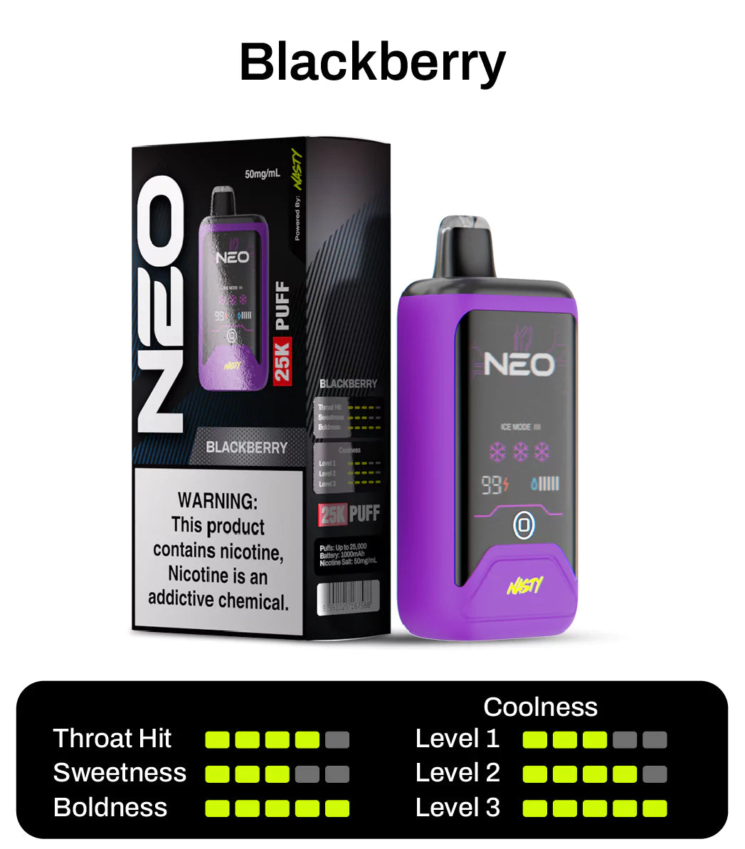 NEO 25K by NASTY is a large capacity rechargeable Nicotine Salt disposable device designed to deliver up to 25,000 puffs of pure flavour satisfaction.