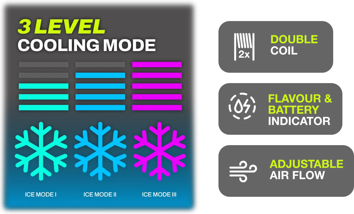 What sets it apart is its 3-level cooling mode, giving you the flexibility to adjust the cooling intensity to suit your preferences. This innovative feature ensures a customisable vaping experience that caters to every tastebud. With the touch of a button, adult users can easily personalise their coolness level for maximum comfort and enjoyment.
